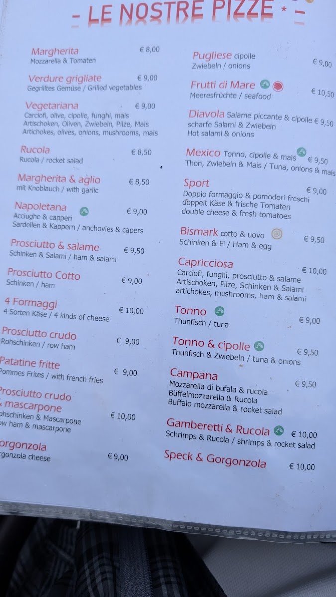 You’ll find classic Italian favorites alongside regional specialties, making it easy to enjoy dishes like Spaghetti Carbonara, Lasagne, or the rich Tagliatelle Ai Funghi Porcini. Seafood also plays a starring role here, with options such as Spagetti Frutti Di Mare and Grigliata Mista Di Pesce reflecting the nearby waters. For lighter moments, simple pizzas like Margherita or the more robust Pizza Schinken Salami fit well with the easygoing atmosphere.